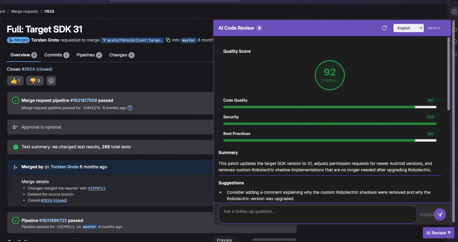 Unlike a bot that might silently fix a formatting error, ThinkReview analyzes the Pull Request and presents its findings to you. It summarizes complex changes, detects subtle logic errors, and highlights security risks. It doesn't make the decision on your behalf; it gives you the context you need to make the right decision yourself.
